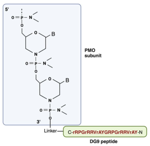 A recently developed cell-penetrating peptide DG9 (Fig. 4) has been shown to have excellent properties. Not only did it greatly increase PMO uptake and exon skipping, it was essentially non-toxic.[4] This was attributed to the five D-arginine residues in the otherwise natural twenty-two L-amino acid peptide which reduced immunogenicity and toxicity. Using a humanized Duchenne muscular dystrophy mouse model (hDMDdel45;mdx), Shah et al. found the DG9-PMO increased dystrophin levels approximately 9-fold compared to the untreated controls, averaging over three tissue types, whereas the naked PMO was approximately half that amount. The biomarkers for liver damage, ALT and AST, were slightly elevated for the naked PMO; however, interestingly, the ALT and AST levels for the DG9-PMO-treated mice were statistically the same as wild-type. Likewise, the biomarker BUN levels that are indicative of kidney dysfunction were statistically the same as wild-type. Taken together, these data suggest DG9 to be an excellent CPP for PMOs. Other strategies to improve cell uptake are Fab/Antibody-PMO conjugates that target transferrin receptor 1, which is used, for example, in DYNE-251 that is now in phase 1 clinical trials.