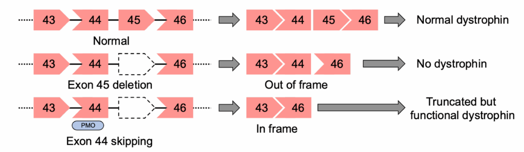 Dystrophin is the largest expressed gene in the human body and has 79 exons. The majority of Duchenne muscular dystrophy occurs due to exon deletions at two ‘hot spot’ regions where one or more exons are deleted: exons 2-20 and 45-55. Shown in Fig. 3 is an example of the deletion of exon 45 of the DMD gene. Exon 45 is asymmetric with its 5’ intron phase 0 and its 3’ intron phase 1 (shown as a pentagonal shape). Deletion of exon 45 leads to a shift in the reading frame and no functional dystrophin being produced. However, if an antisense oligo (ASO) blocks the splicing of exon 44, then the reading frame is restored, and a functional (albeit truncated) dystrophin is produced.