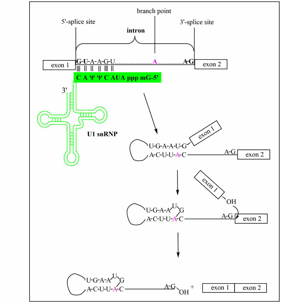 Splicing is carried out by the spliceosome which is composed of small nuclear RiboNucleotide Proteins (snRNPs) U1, U2, U4, U5, U6, and their associated Sm proteins. This forms a dynamic spliceosome structure with a molecular weight between 1.7 to 3.1 MDa as subunits are added and removed during the splicing process. Shown in Fig. 1 are the main pre-mRNA intermediates observed during splicing: recognition of the 5’ splice site by U1, folding the pre-mRNA into a stem-loop structure that brings the branchpoint adenosine vicinal to the conserved G of the 5’-splice site; the formation of lariat structure with a 2’-5’ linkage of the adenosine to the 5’-G of the intron causing the release of exon 1; and finally the nucleophilic attack by the 3’-OH of exon 1, leading to the cleavage of the lariat from exon 2 and the formation of the exon-exon junction.