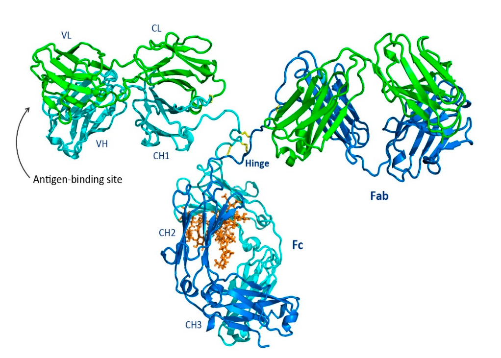 Fig. 1 Shown is a ribbon representation of IgG from the Protein Data Bank of the murine IgG2a. The heavy chains are blue and cyan, and the light chains are shown in green. Three disulfide bonds in the hinge region are shown in yellow. The glycan (brown) is located at the same position in both mice and humans at Asn297. Reprinted from Chiu, Mark; Goulet, Dennis; Teplyakov, Alexey; and Gilliland, Gary. Antibody Structure and Function: The Basis for Engineering Therapeutics. Antibodies, vol. 8, p. 55 (2019) under the Creative Commons CC BY 4.0 public use license.