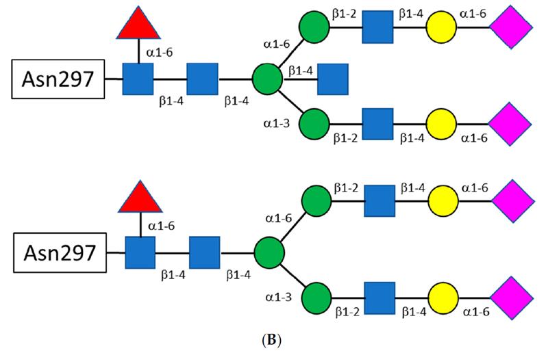 The glycan attached to Asn297 is a biantennary complex. Shown in Fig. 2 are the constituent sugars. Of particular interest are fucose and sialic acid (shown as red triangles and fuchsia diamonds, respectively, in Fig. 2). When the glycan is fucosylated, binding to the FcγRIIa is significantly reduced, leading to a decrease in antibody-dependent cellular cytotoxicity (ADCC). Sialylation, on the other hand, appears to increase binding to the FcγRIIb, an anti-inflammatory receptor, thereby reducing the immunogenic response of IgG bearing sialic acid on the glycan antenna.[4] Interestingly, the addition of a bisecting N-acetylglucosamine (GlcNAc) does not affect binding to the FcγRIIa but instead sterically prevents fucosylation, resulting in increased ADCC.[5]