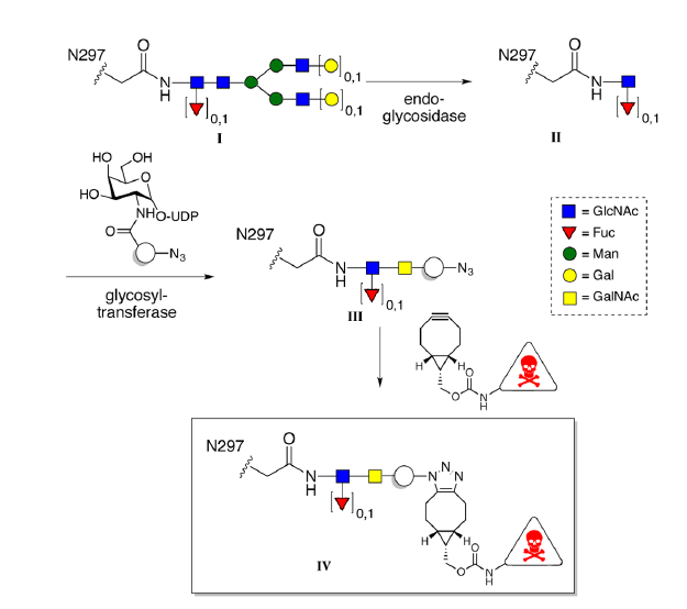 Fig. 3 Shown is the glycan remodeling strategy used to attach a cytotoxic payload to the conserved Asn297 of IgG immunoglobulins. Reprinted from Remon van Geel et al., Chemoenzymatic Conjugation of Toxic Payloads to the Globally Conserved N-Glycan of Native mAbs Provides Homogeneous and Highly Efficacious Antibody–Drug Conjugates, Bioconjugate Chemistry 2015 26 (11), 2233–2242 under the Creative Commons CC BY 4.0 public use license.